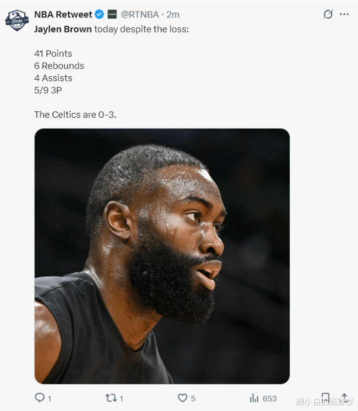 布朗开赛季的三场比赛都拿到20+,首战23分,次战25分,这场比赛拿到41分,但绿凯就是无法拿到胜利。