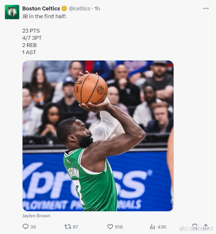 杰伦布朗开场手感就很好,5分钟里5中4+三分2中2拿到10分,如果不是早早2次犯规,绿凯在首节可以领先的更多。上半场布朗15分钟,13中7,三分7中4,拿到23分2篮板1助攻,他个人发挥没有任何问题。