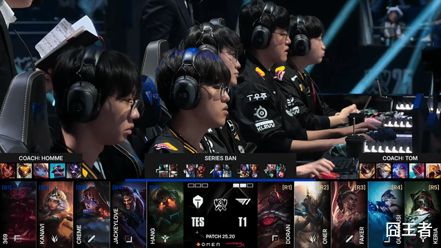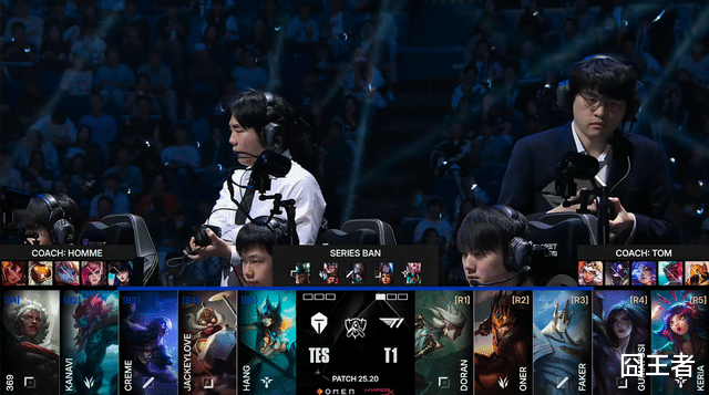 第一局比赛,T1蓝色方,禁用:永恩;芸阿娜;发条;狼母;妮蔻,选用:Doran铁男;Oner赵信;Faker发条;Gumayusi韦鲁斯;Keria洛;TES红色方,禁用:沙皇;波比;巴德;鳄鱼;牛头,选用:369奎桑提;Kanavi猴子;Creme阿卡丽;JackeyLove希维尔;Hang卡尔玛
