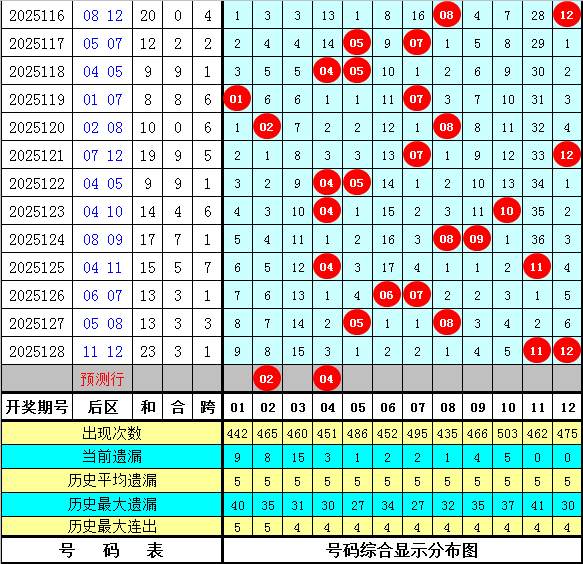 石浩第2025129期大乐透后区分析:后区上周星期三后区奖号为06和07,上期开出奖号11和12,最近9周星期三与最近9期后区奖号奇偶比分别为6:12和7:11,大小比分别为9:9和11:7,本期预计后区开出全小组合。注意号码02、03、04、05。