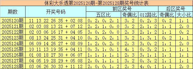 体彩大乐透第2025128期奖号为03 06 26 30 33 + 11 12,前区号码五区比为2:0:0:1:2,奇偶比为2:3,012路比为4:0:1,后区号码奇偶比为1:1,大小比为2:0。