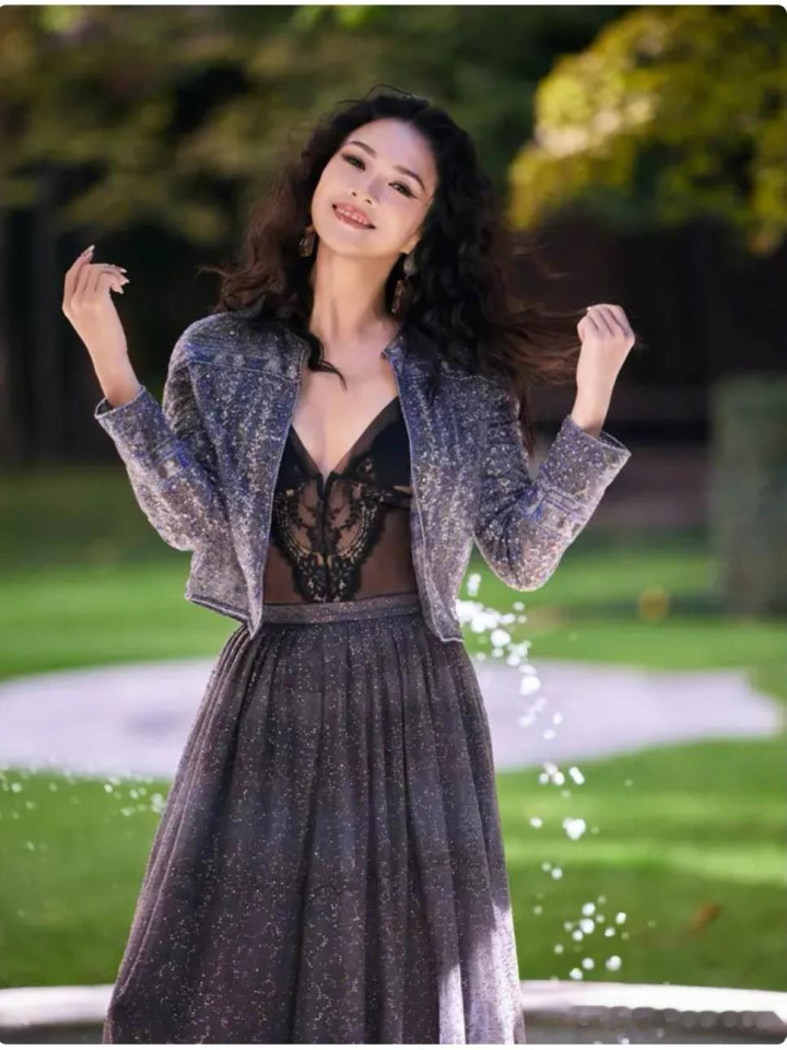 这场亮相更藏着时装周的重磅分量——她身着的造型涵盖品牌压轴与开场款,亮钻星空半裙配重工刺绣外套的温婉,蓝绿色钉珠夹克搭黑丝绒长裤的利落,与黑丝透视装形成风格碰撞,尽显时尚驾驭力。看秀席上,她与胡歌侃侃而谈时从容不迫,被镜头围堵时身姿挺拔,即便是生图中略显圆润的面庞,也丝毫未减那份“两米八”的气场,大背头造型更被时尚博主称赞“非实力者不敢尝试”。
